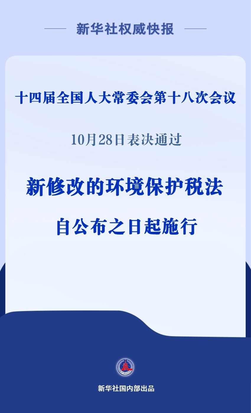 10月28日,第十四届全国人民代表大会常务委员会第十八次会议表决通过关于修改环境保护税法的决定,自公布之日起施行。修改后的环境保护税法增加了一条,主要内容是:国务院根据国民经济社会发展和环境保护的需要,试点对本法所附《污染物税及等值税额表》规定的环境税和其他税种征收可变环境保护税。试点实施办法由国务院制定,报全国人民代表大会常务委员会备案。有机物的挥发性是细颗粒物(PM2.5)和臭氧的重要来源,可造成雾霾、光化学烟雾等大气环境问题。目前有可检测300多种挥发性有机化合物。 2016年环境保护税法制定时,此前征收排污费的苯、甲醛等18种挥发性有机物将被征收环境保护税。新修订的环境税保护法扩大了挥发性有机物征税范围,有利于进一步加强挥发性有机物管理,改善空气质量,加强生态环境保护。记者:刘凯雄 海报制作:刘凯雄 新华社内部制作